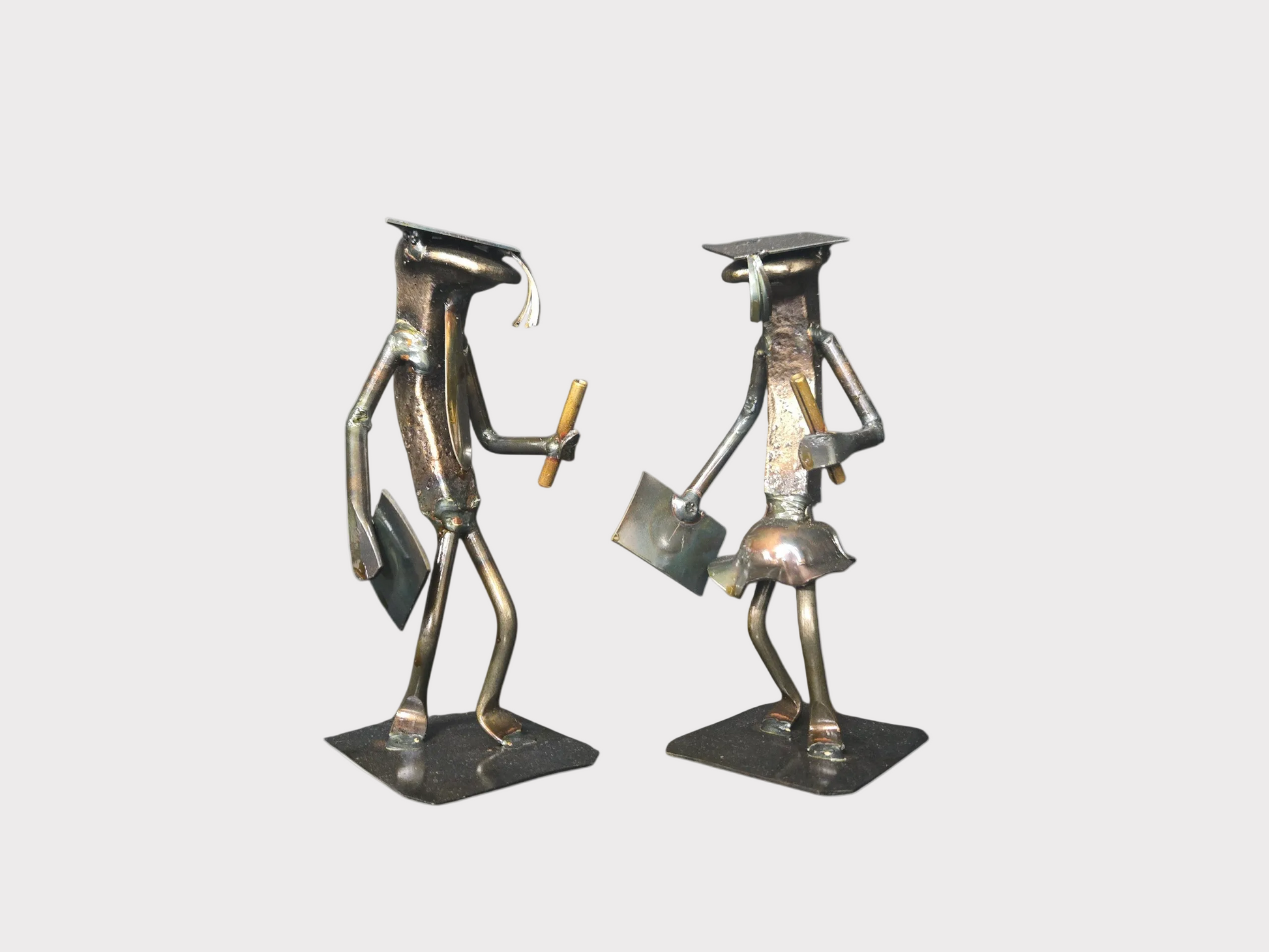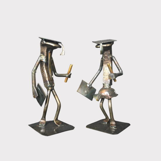 Honor the milestone of graduation with The Graduate Railroad Spike Sculpture. This piece from our railroad spike art collection comes in two variants – one depicting a male graduate, the other a female graduate with a skirt – each proudly holding a diploma in one hand and a rolled-up scroll in the other, complete with a graduation cap placed on their head.