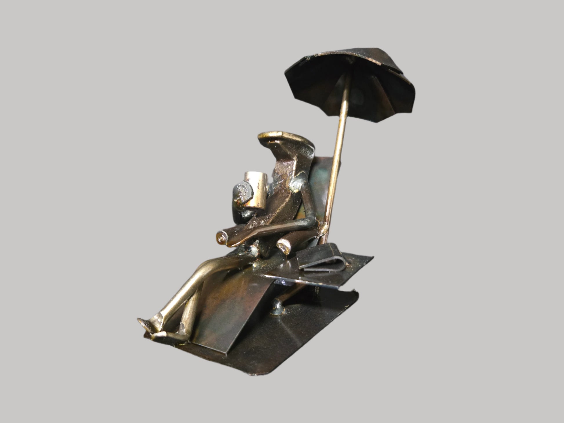 This metal sculpture portrays a figure relaxing on a lawn chair beneath an umbrella, immersed in reading a book with a drink resting on a nearby table. Meticulously crafted, the piece balances tranquility and leisure, showcasing fine metalwork that captures the essence of peaceful downtime. Its durable design and detailed composition make it a sophisticated addition to indoor or outdoor settings, ideal for those who appreciate art that celebrates quiet moments of rest.