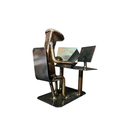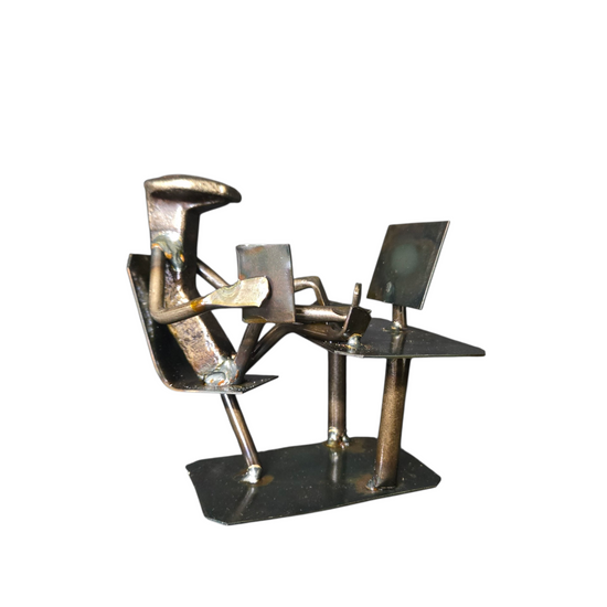 Immerse yourself in the digital age with "Computer," a sculpture that creatively captures the essence of modern work and leisure. Available in two variations, this piece showcases a figurine interacting with a computer in distinct ways. The first variation features a figurine diligently typing at a desk, symbolizing focus and productivity. The second shows the figurine in a more relaxed pose, with legs kicked back and resting on the desk, representing ease and a break from the digital hustle.