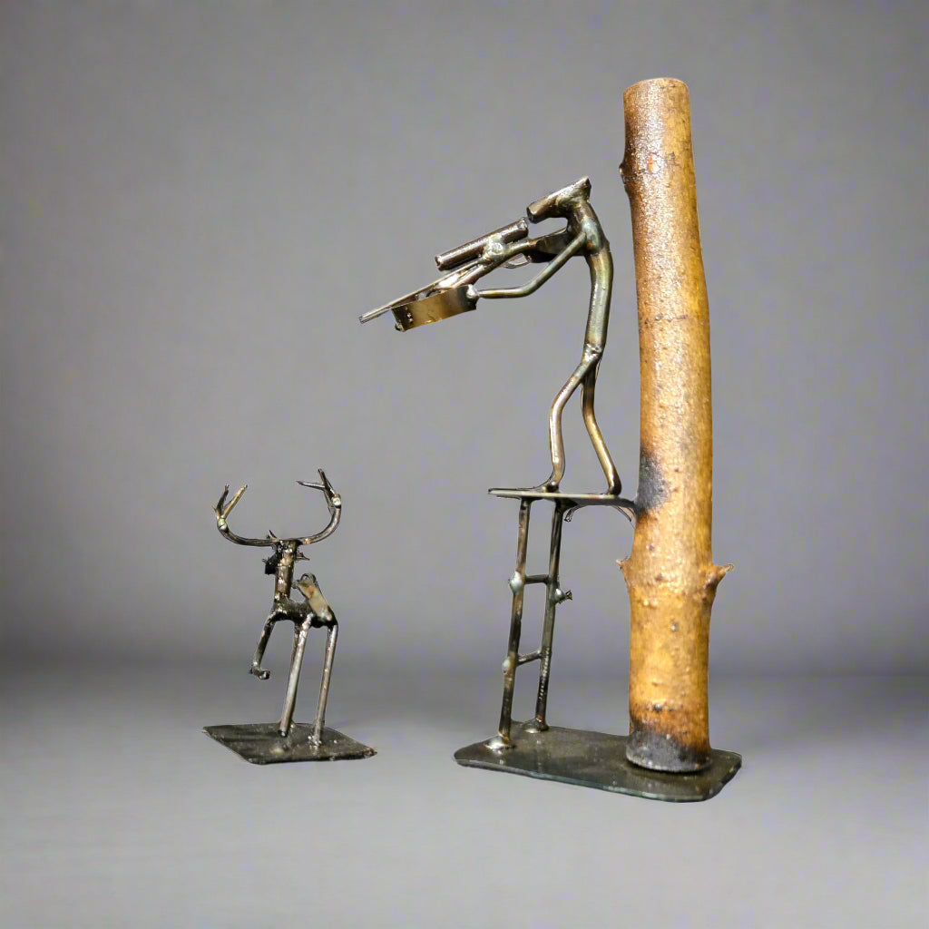- Skillful Craftsmanship: Expertly hand-welded from railroad spikes, each figure — the hunter and the deer — is rendered with attention to realistic detail.