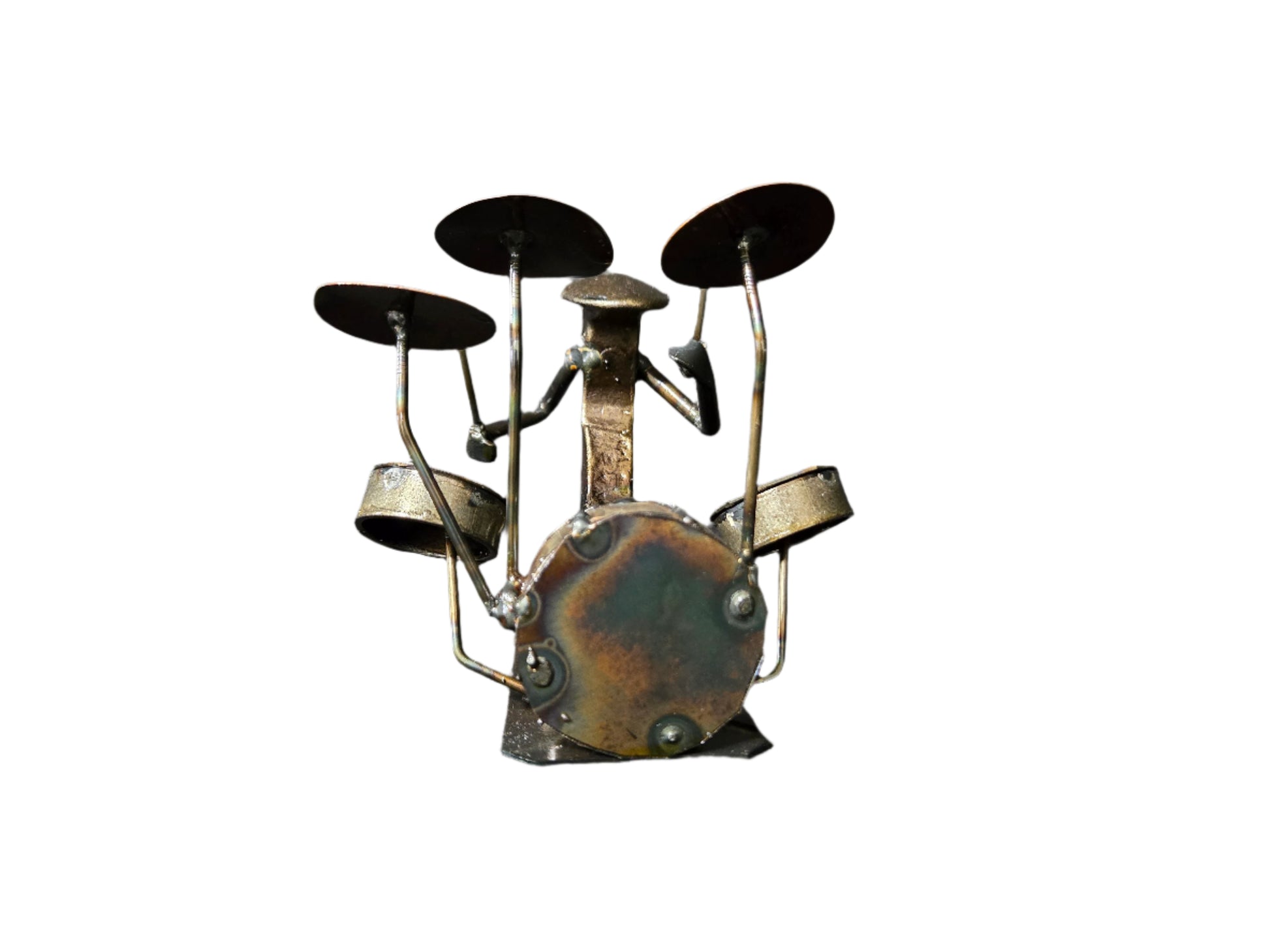 - Artistically Crafted: Skillfully hand-welded from railroad spikes, each element of the drum set and the figurine is rendered with precision, mirroring the meticulous nature of a drummer's skill.