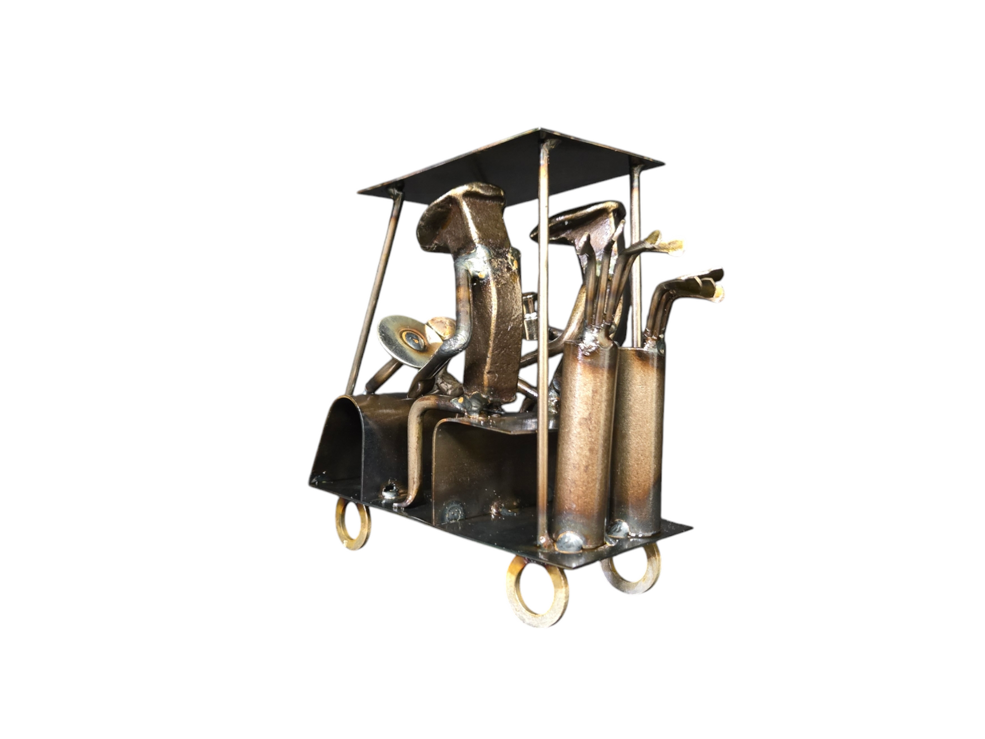 - Detailed and Dynamic: Each figure and the golf cart are meticulously handcrafted from railroad spikes, highlighting the joy and sociability of the sport.
