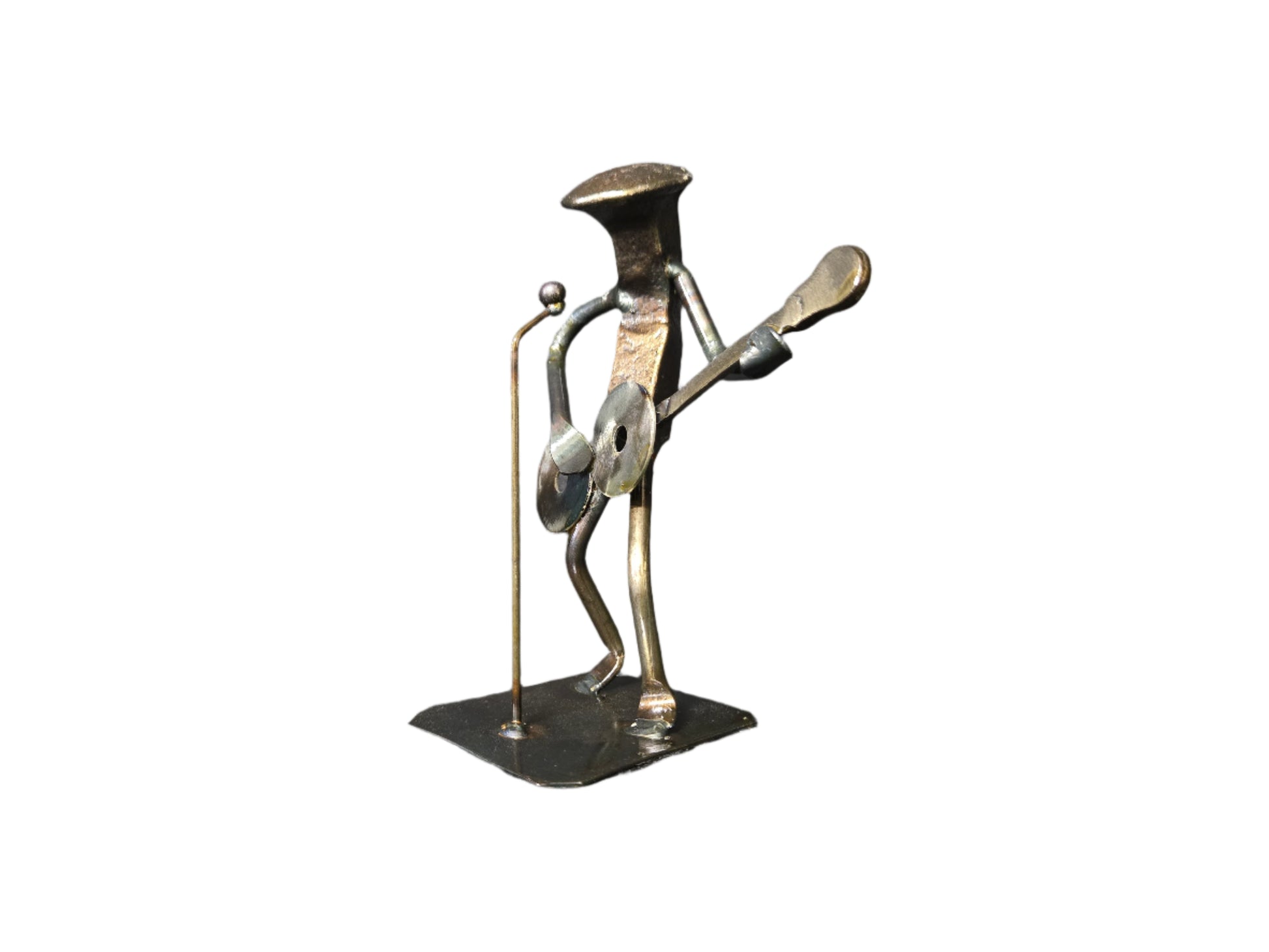 - Exquisite Craftsmanship: Hand-welded from durable railroad spikes, the sculpture demonstrates detailed artistry in the guitar, microphone, and musician's posture.
