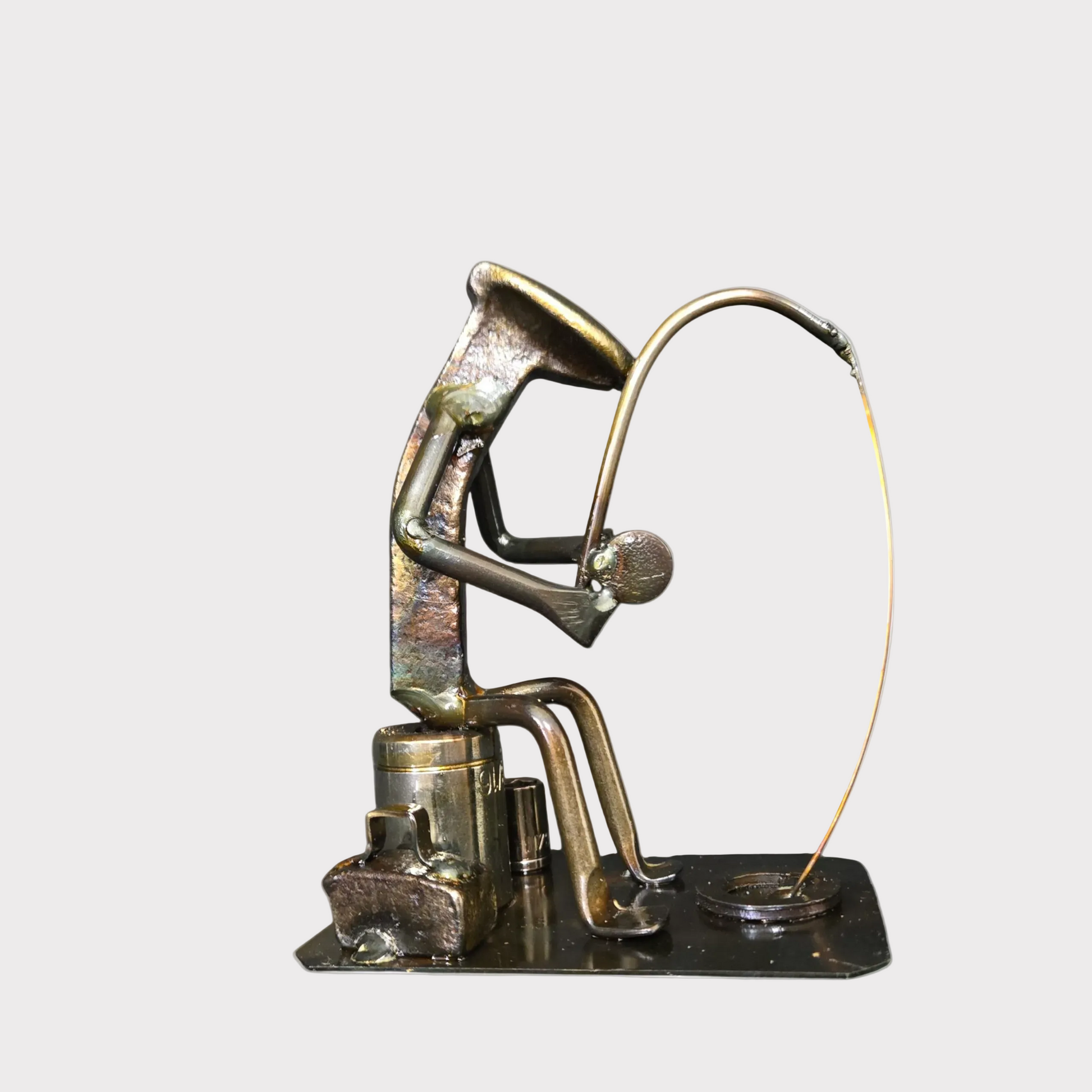 Handcrafted metal railroad spike sculpture capturing a timeless winter scene. This intricate piece depicts a figure seated on frozen ice, fishing line extended into the water below, accompanied by a tacklebox and bucket positioned at ground level.