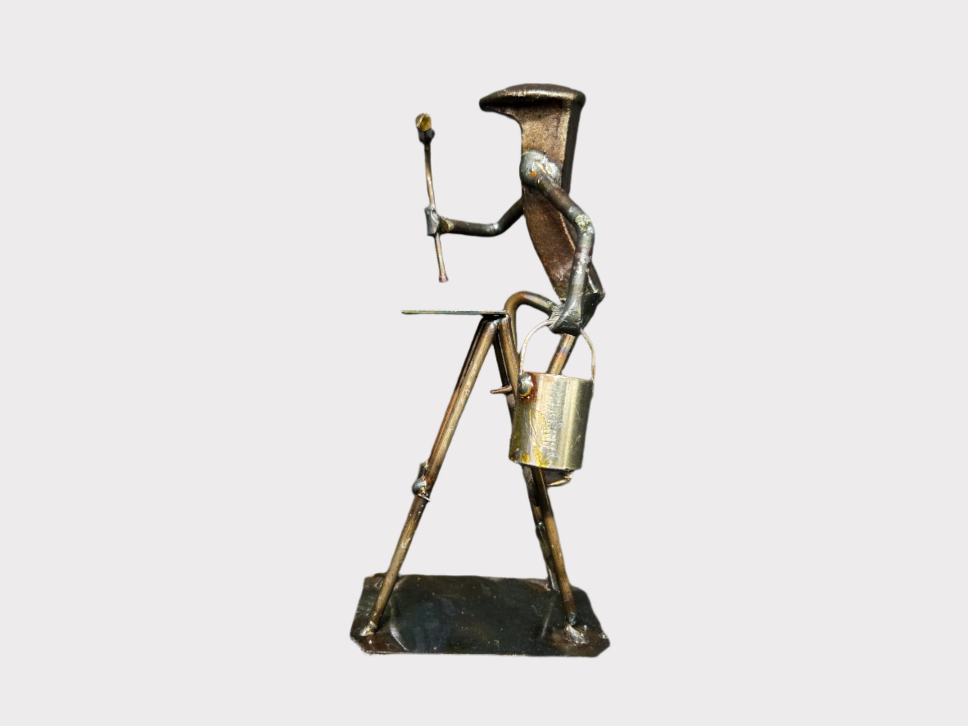 This metal sculpture depicts a painter skillfully perched on a ladder, capturing a moment of artistic dedication. Crafted with precision, it offers a striking blend of industrial materials and creative expression, making it an ideal piece for those who appreciate detailed metalwork and artistic themes. Its robust construction ensures durability, while the dynamic pose adds visual interest, perfect for enhancing any home or office space with a touch of craftsmanship and inspiration.