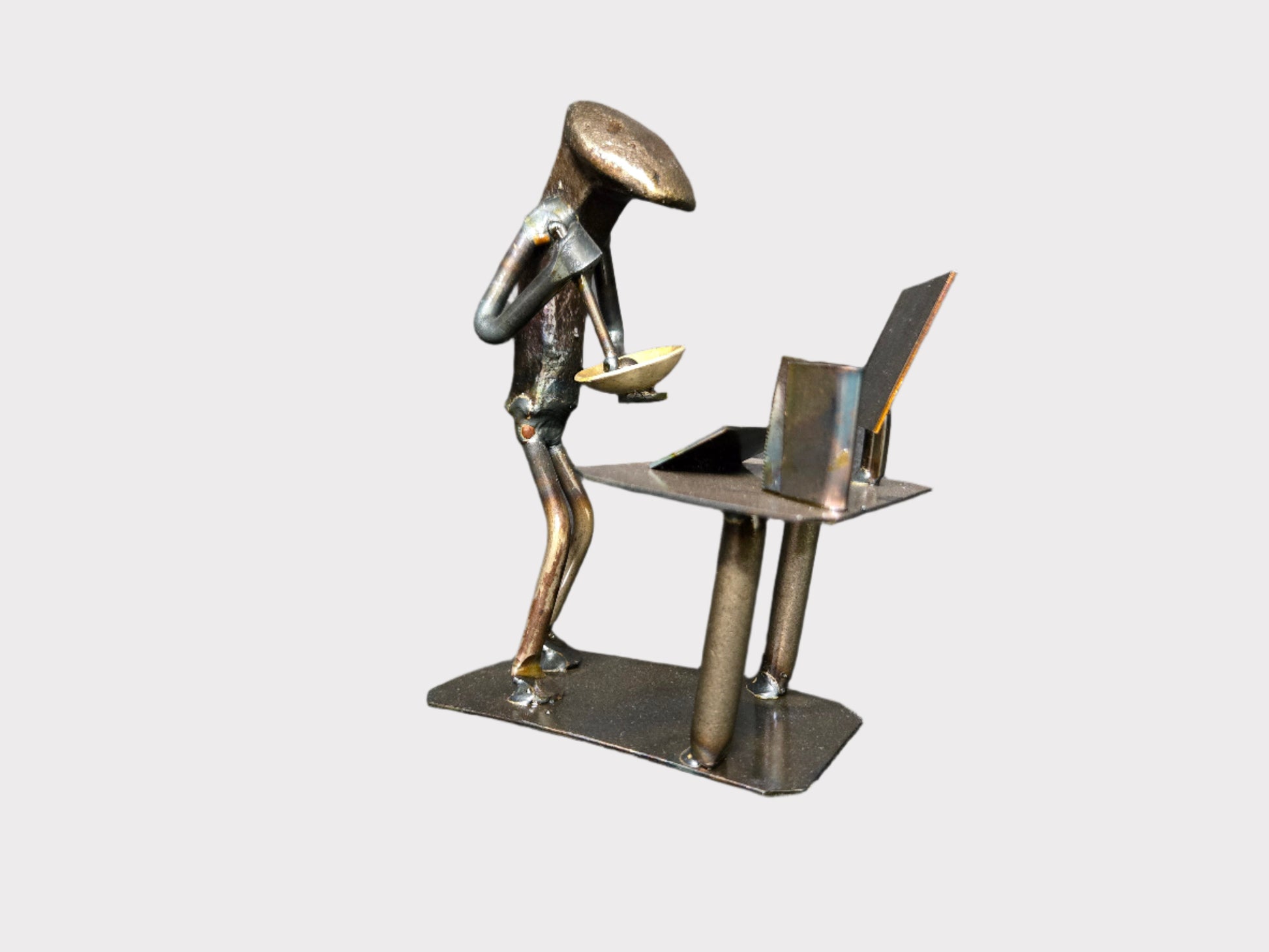 - Artistic Craftsmanship: Skillfully handcrafted from durable railroad spikes, the sculpture includes intricate elements like the bowl, computer monitor, and the pharmacist's focused posture.