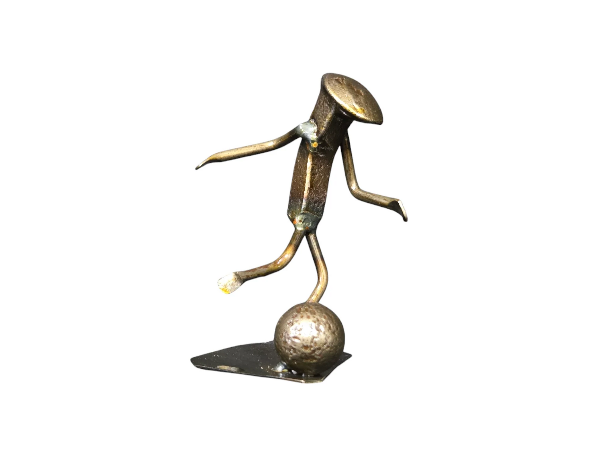 Celebrate the world's favorite sport with our Soccer Railroad Spike Figurine. This piece from our railroad spike art collection showcases a soccer player in mid-action, with their leg drawn back, ready to strike the ball.