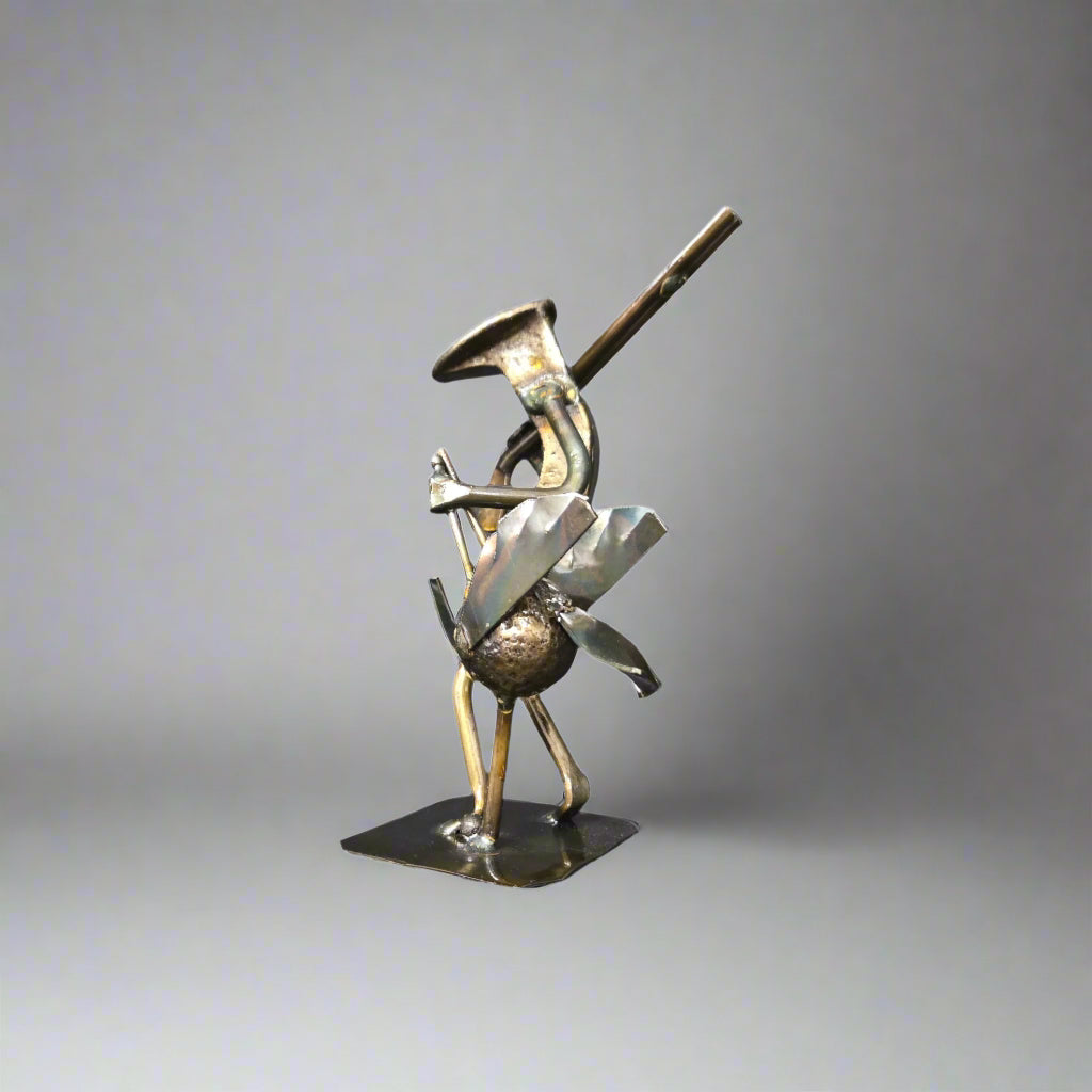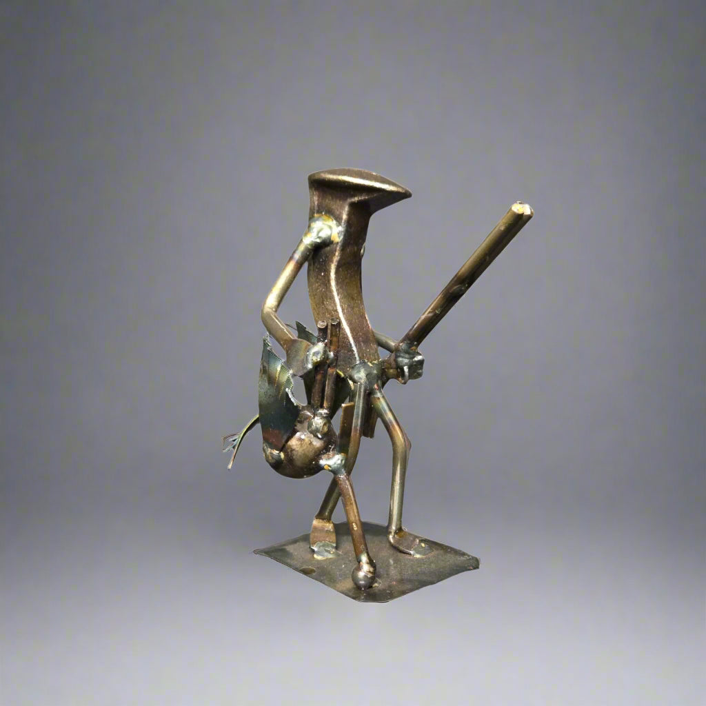Celebrate the spirit of the hunt with our Turkey Hunter Railroad Spike Figurine. A standout in our railroad spike art series, this sculpture authentically captures the essence of turkey hunting, showcasing a hunter with a turkey in one hand and a rifle slung over the shoulder.