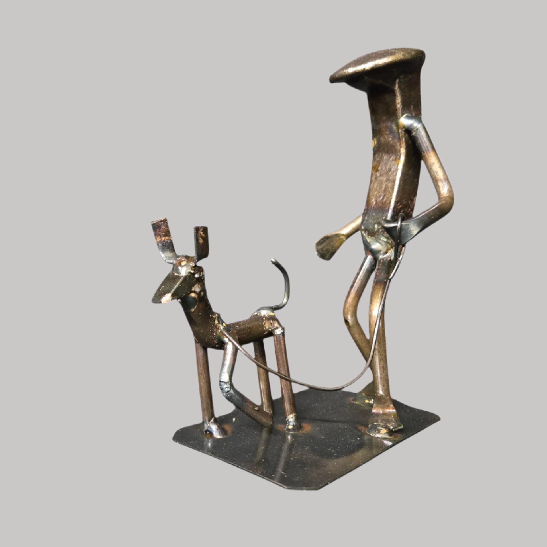 Celebrate the joy of pet ownership with the Walking the Dog Railroad Spike Figurine. As a unique piece in our railroad spike art collection, this sculpture depicts a person out for a walk with their dog, connected by a leash, showcasing the everyday bond between humans and their furry friends.